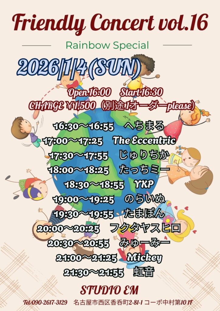 HOME > イベントスケジュール > イベントスケジュール 1/4(日)Friendly Concert vol.16@STUDIO EM 投稿日:2025年11月19日 Twitter Share Google+ Pocket Hatena LINE -イベントスケジュール