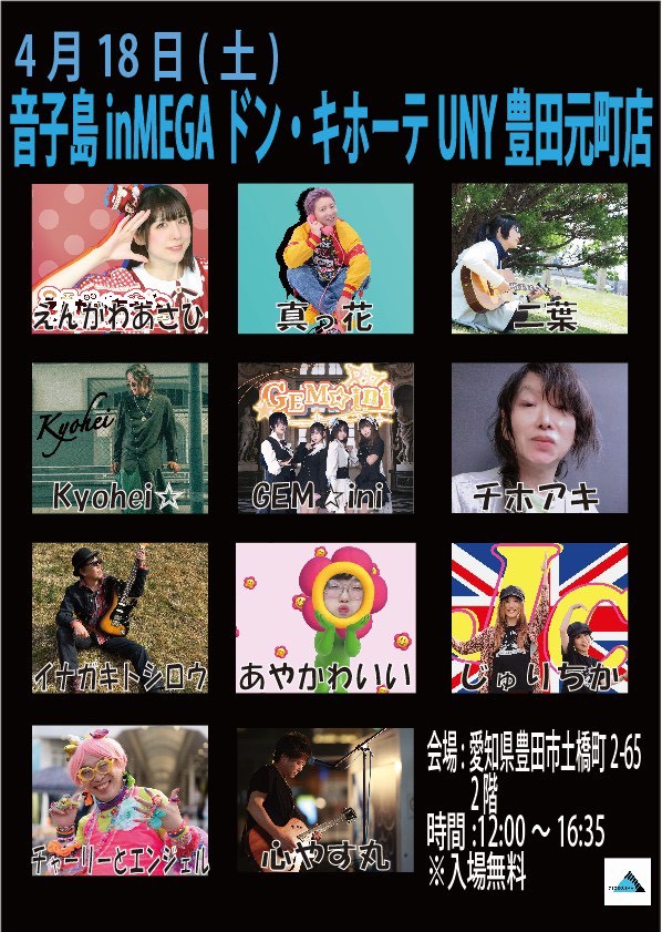 HOME > イベントスケジュール > イベントスケジュール 4/18(土)音子島@豊田ドン・キホーテ 投稿日:2026年4月8日 じゅりちか15時ごろの出演となります Twitter Share Google+ Pocket Hatena LINE -イベントスケジュール